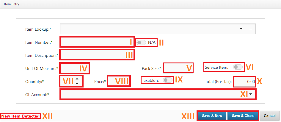 XII: Saving – “Save & New” will open a new Item Entry screen while saving and adding the old item to the requisition form. “Save & Close” will save the Item Entry screen and save your item to the requisition form.