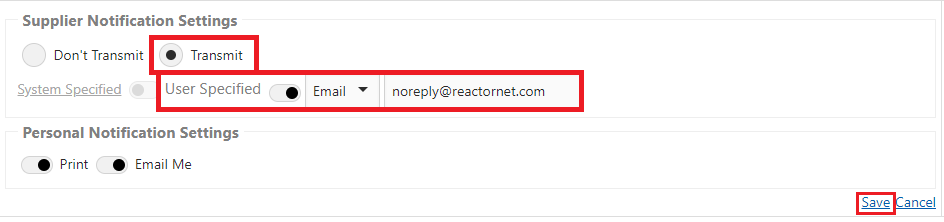 Select Transmit under Supplier Notification Settings, Choose Fax or Email from the User Specified drop down list, Enter the corresponding information in the blank provided.
