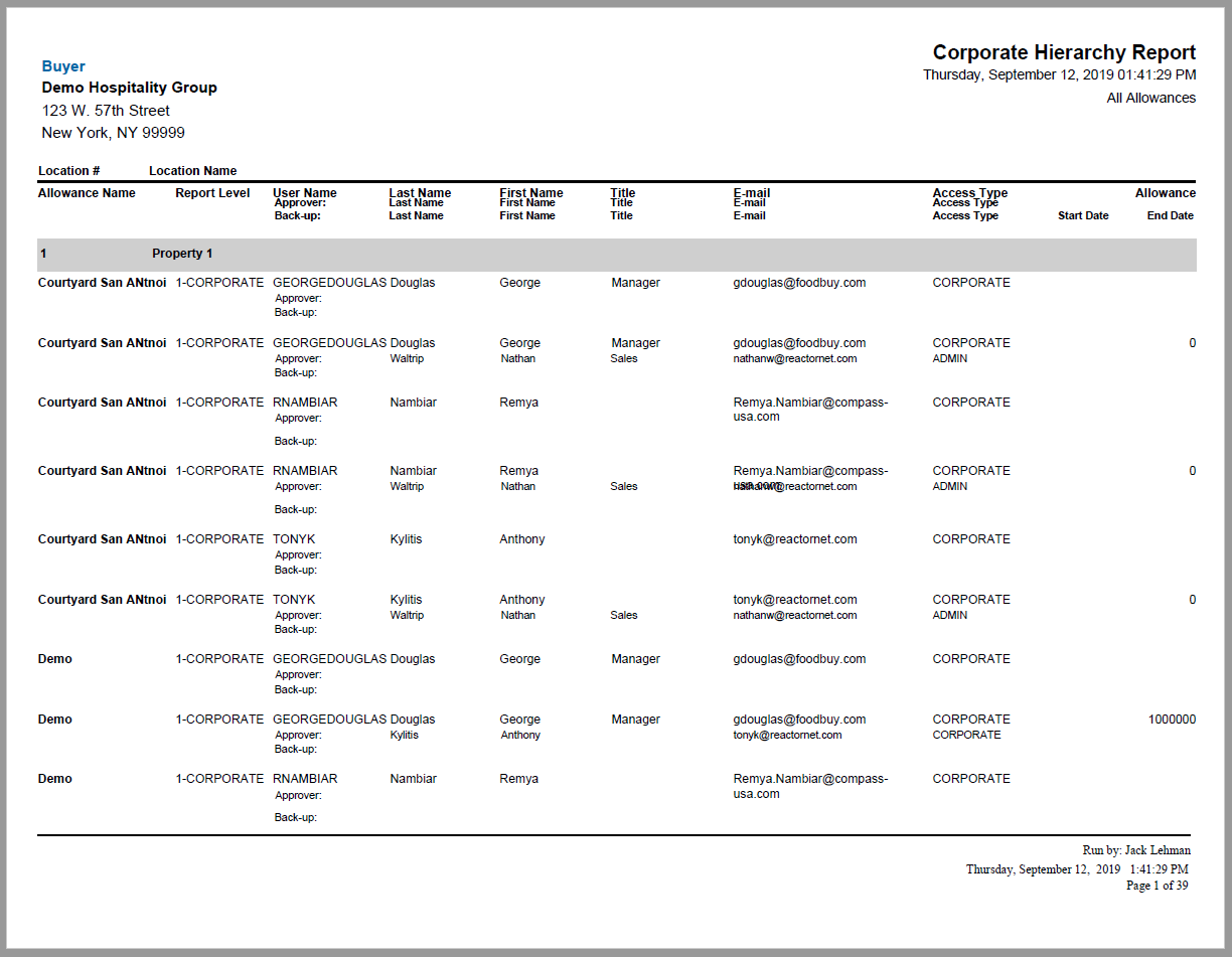 General Setup | Corporate Hierarchy Report | List of corporate-level users and their allotted spend for allowances. | |