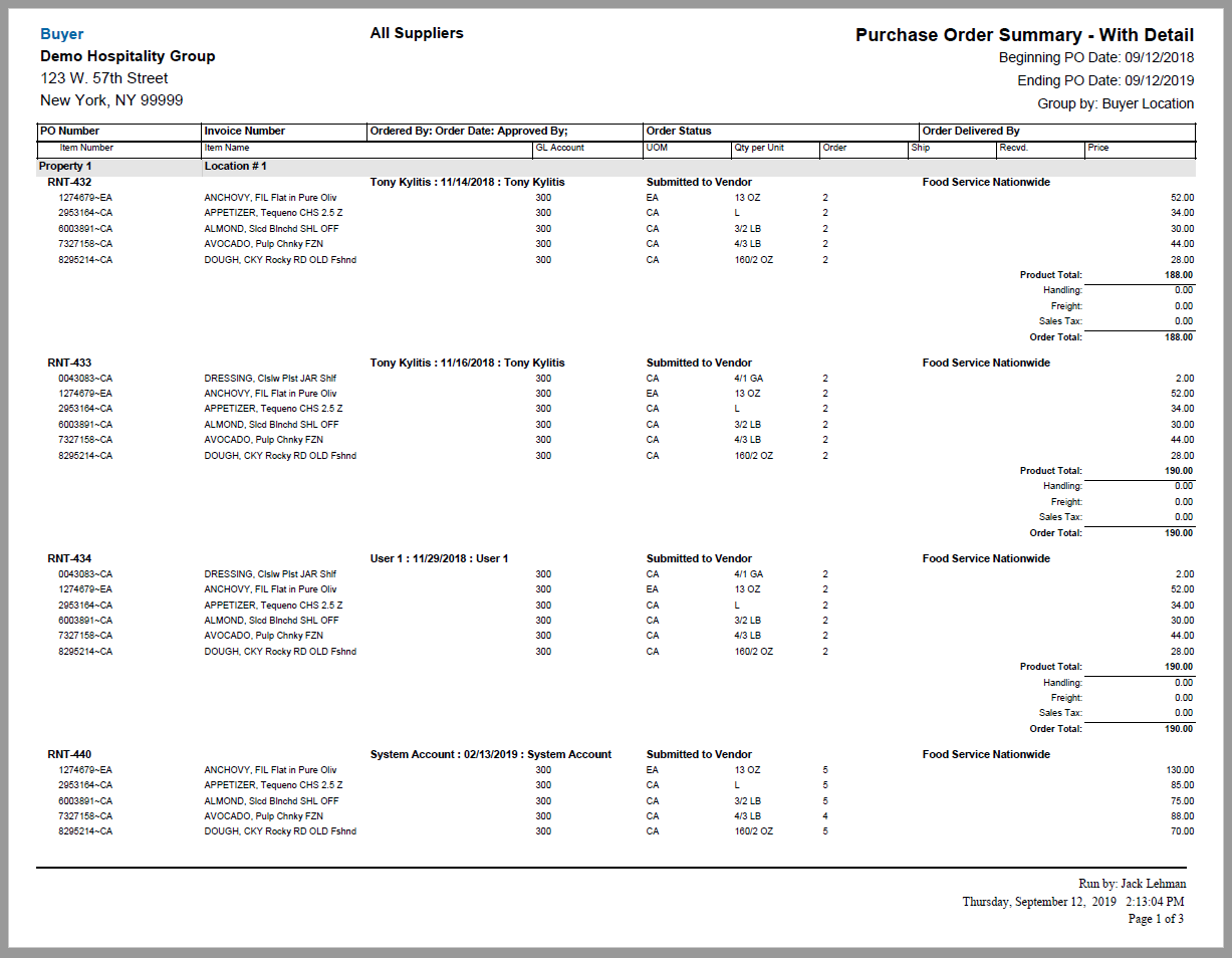 Purchase Order | PO Summary - With Detail | List of Purchase Orders per location with additional header detail. |